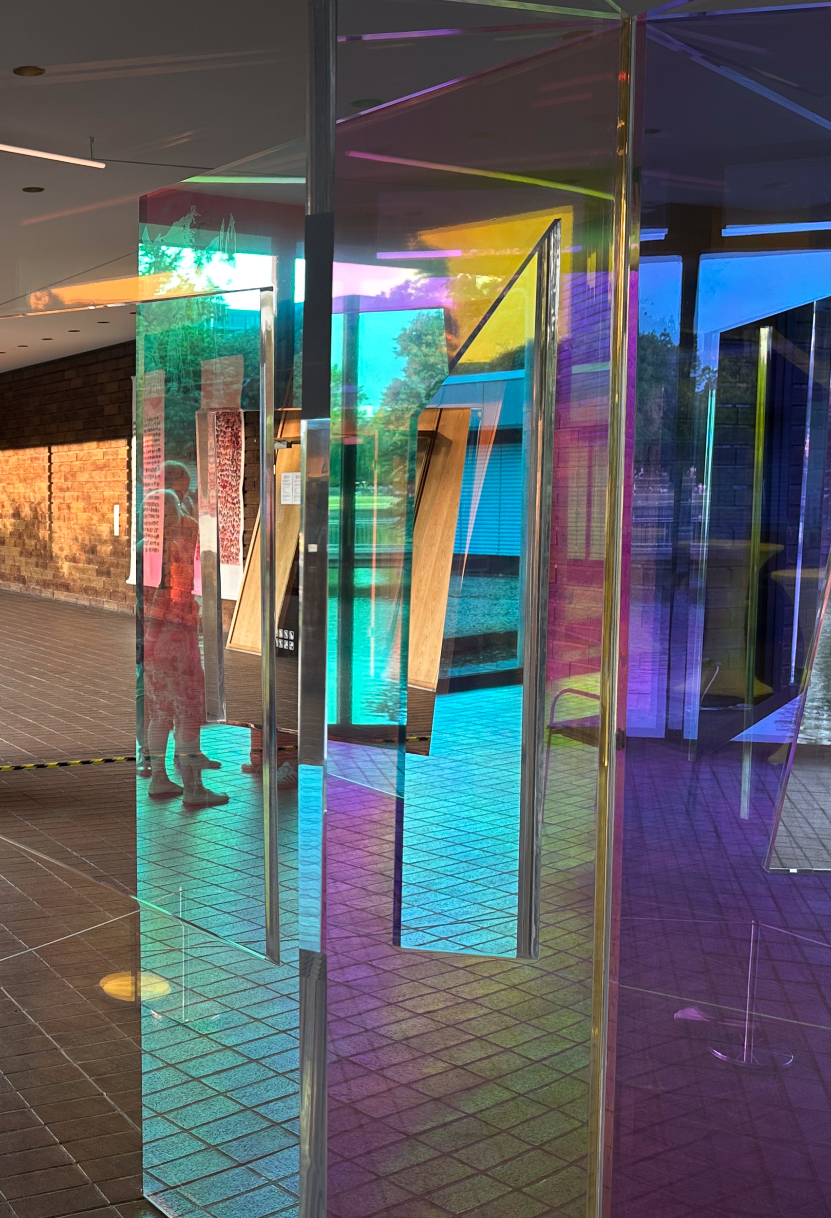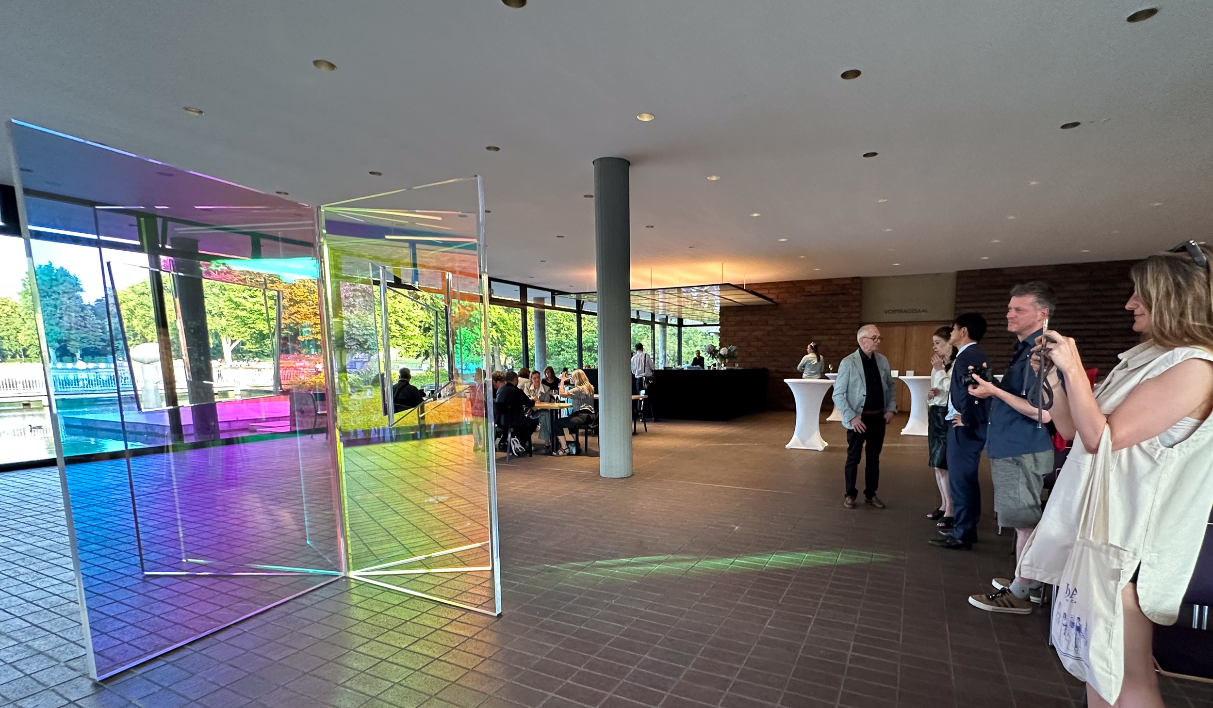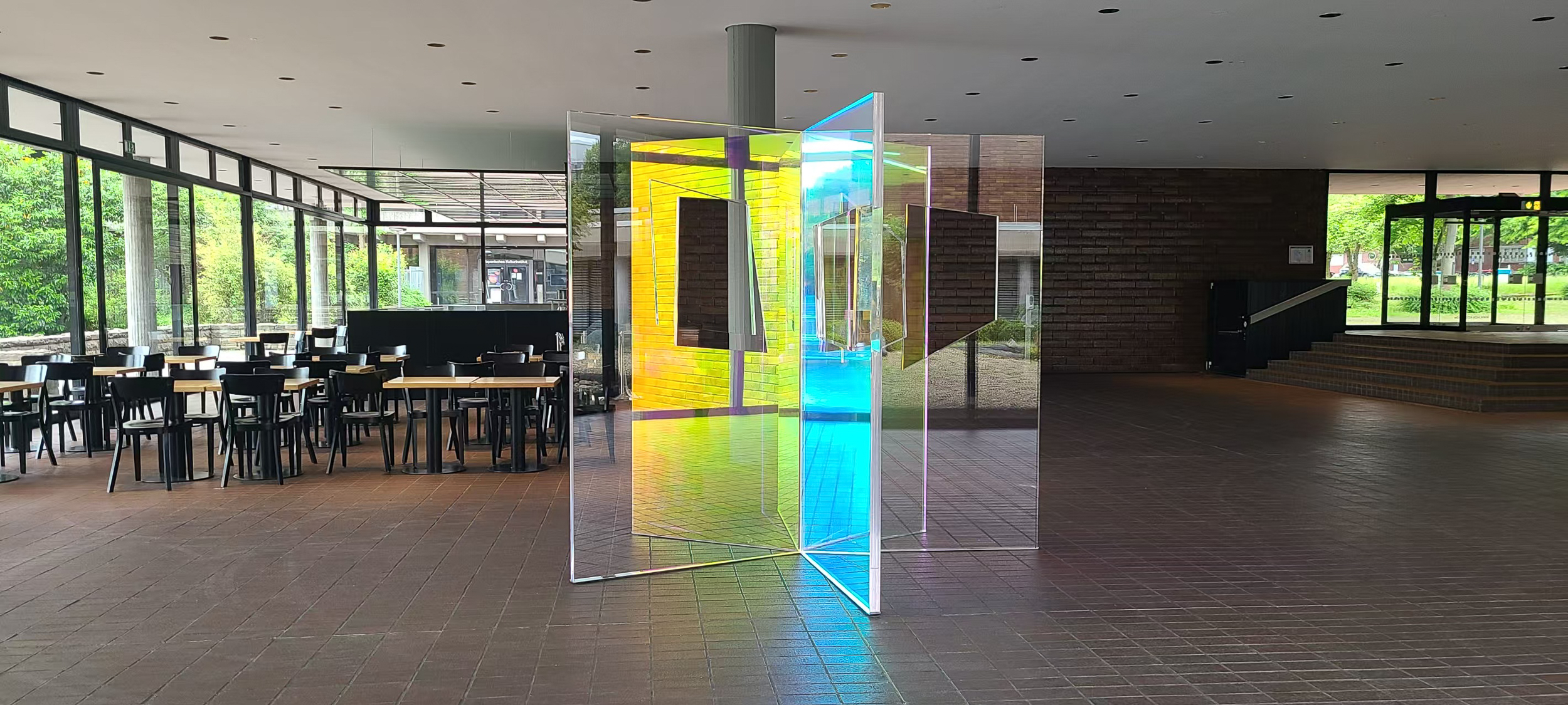 The transparent, iridescent nature of the panels creates a prismatic spectrum that, radiating from a central point, crystallizes and focuses at the edges of the panels and their "window frames," radiating in various directions. No two walks around the sculpture are the same: external factors such as time of day, season, and weather conditions redefine each moment of light and shadow, thus creating new spectral effects of reflection and deflection. Ultimately, however, we decide our own mode of viewing, as the work's title suggests: With or Without Edge. In the artist's own words: "The title With or Without Edge implies an ambiguity that productively activates the viewer's autonomy in terms of how they perceive the work."