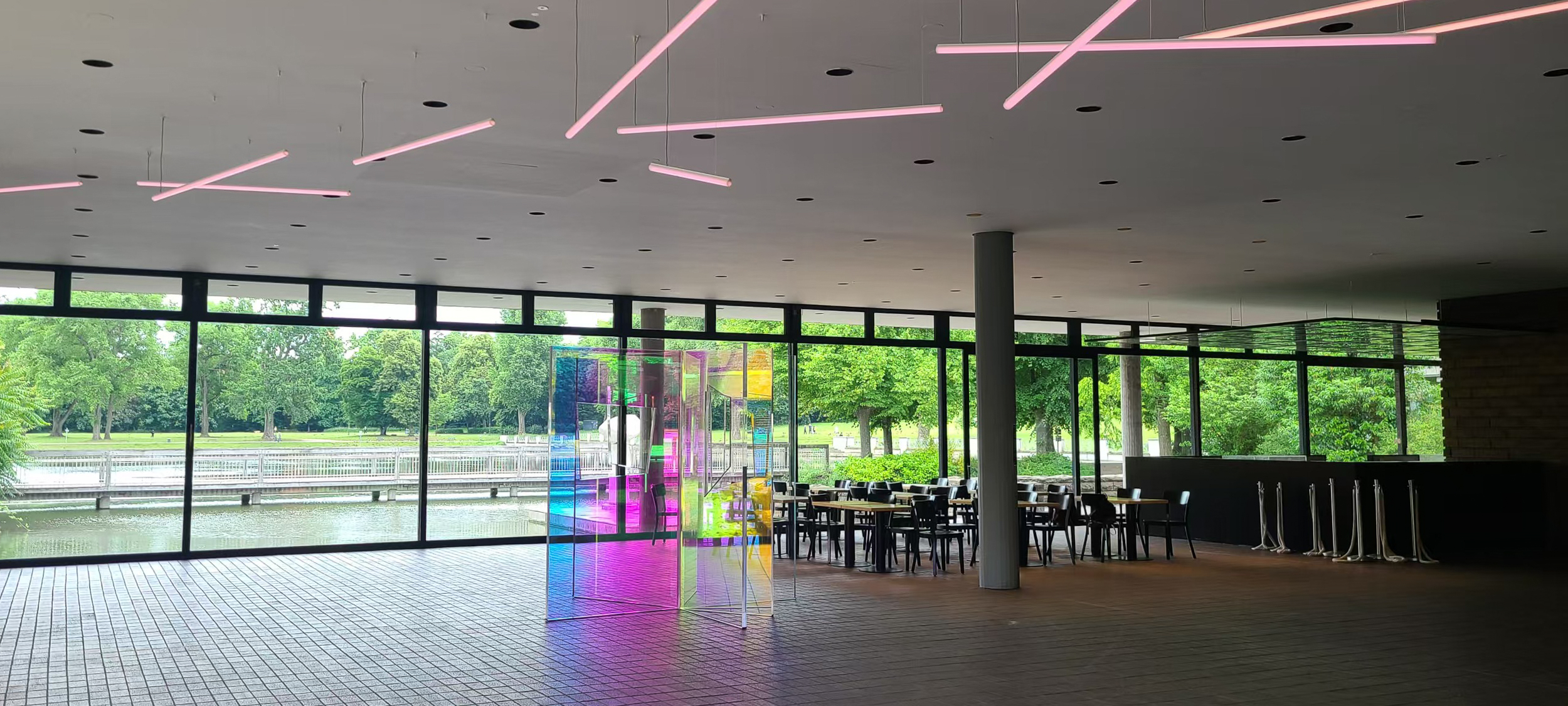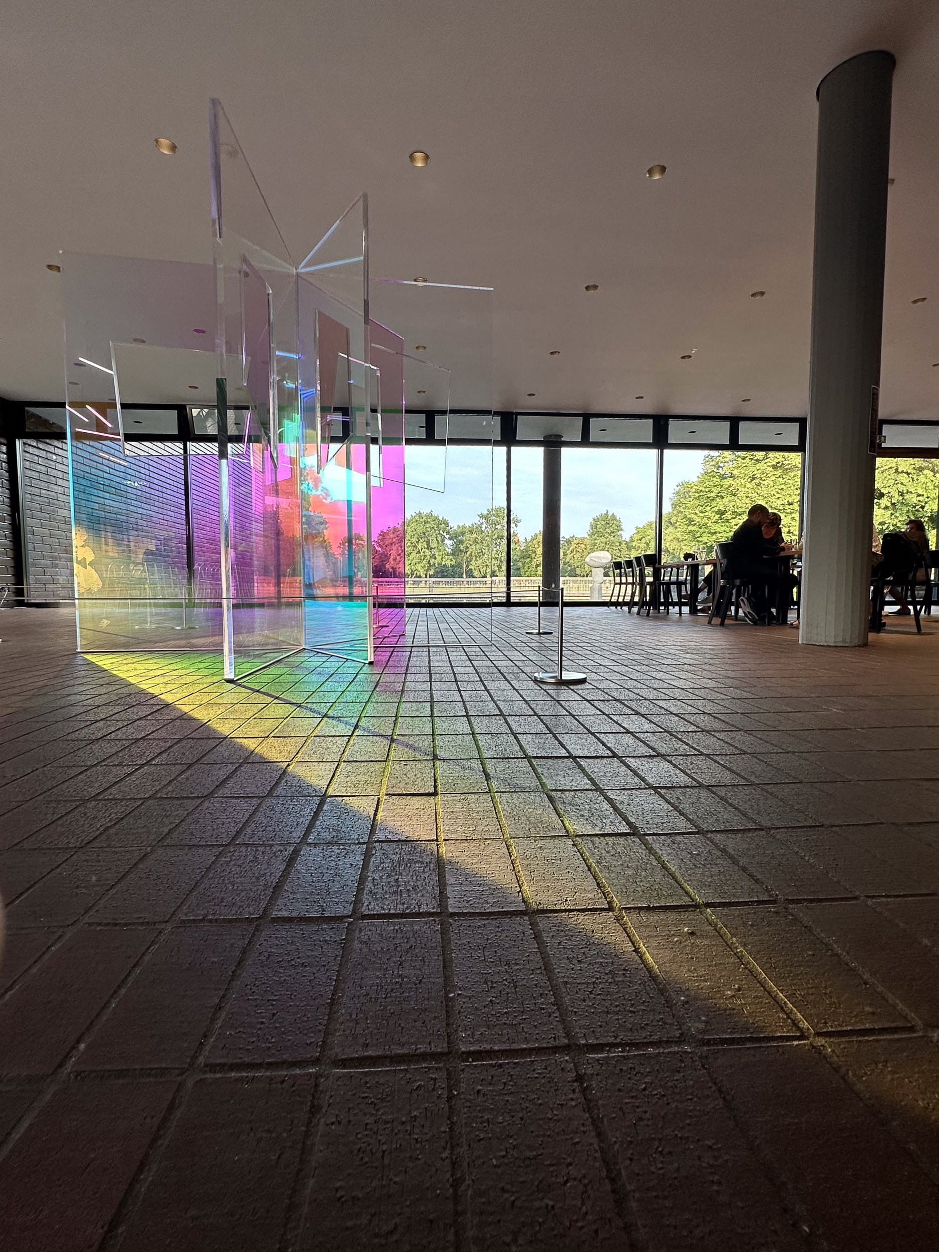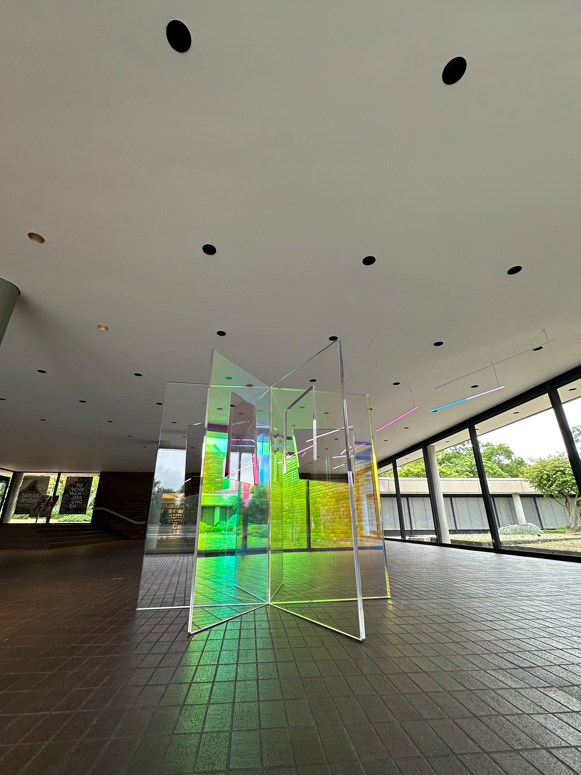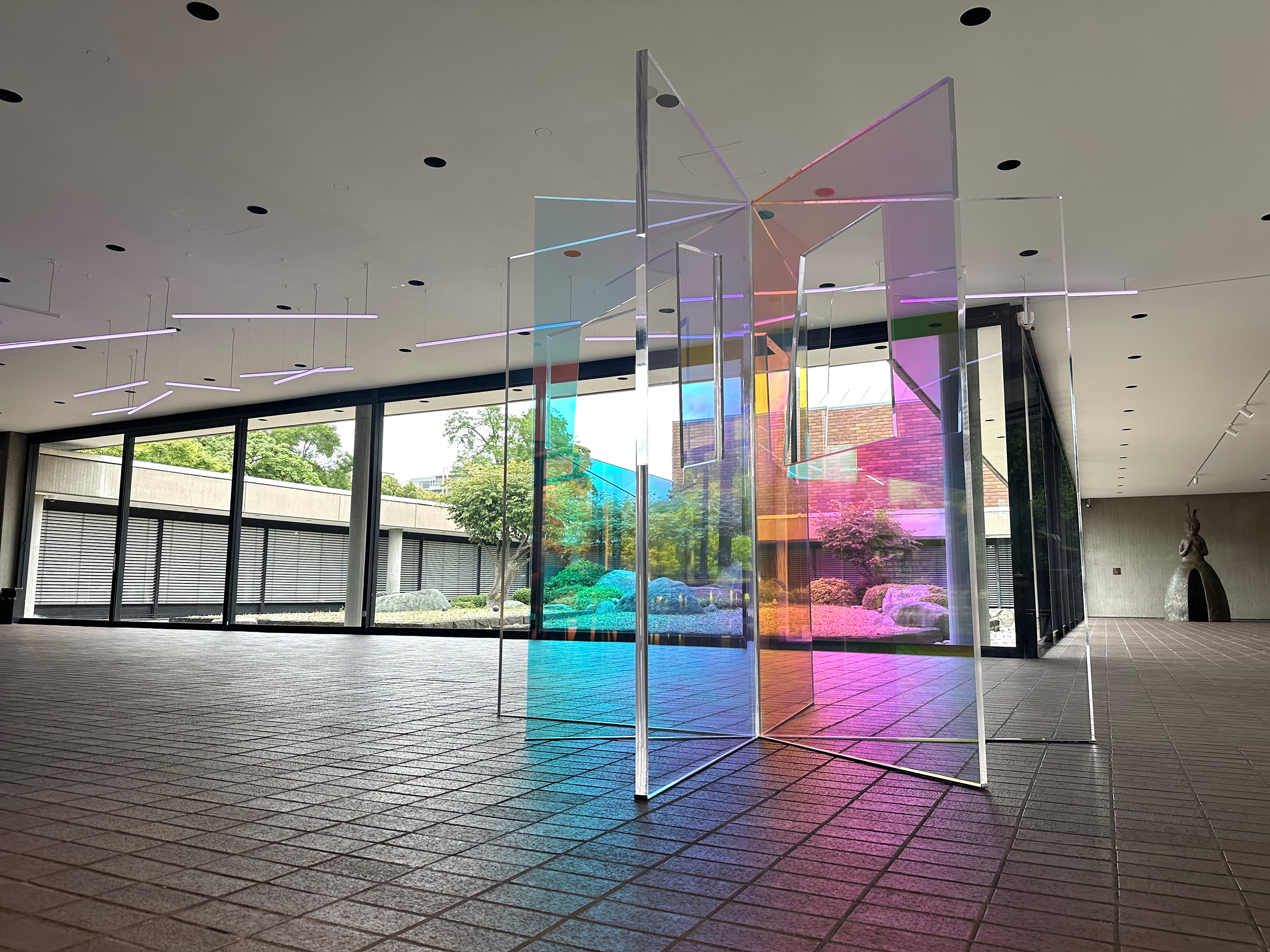 The transparent, iridescent nature of the panels creates a prismatic spectrum that, radiating from a central point, crystallizes and focuses at the edges of the panels and their "window frames," radiating in various directions. No two walks around the sculpture are the same: external factors such as time of day, season, and weather conditions redefine each moment of light and shadow, thus creating new spectral effects of reflection and deflection. Ultimately, however, we decide our own mode of viewing, as the work's title suggests: With or Without Edge. In the artist's own words: "The title With or Without Edge implies an ambiguity that productively activates the viewer's autonomy in terms of how they perceive the work."