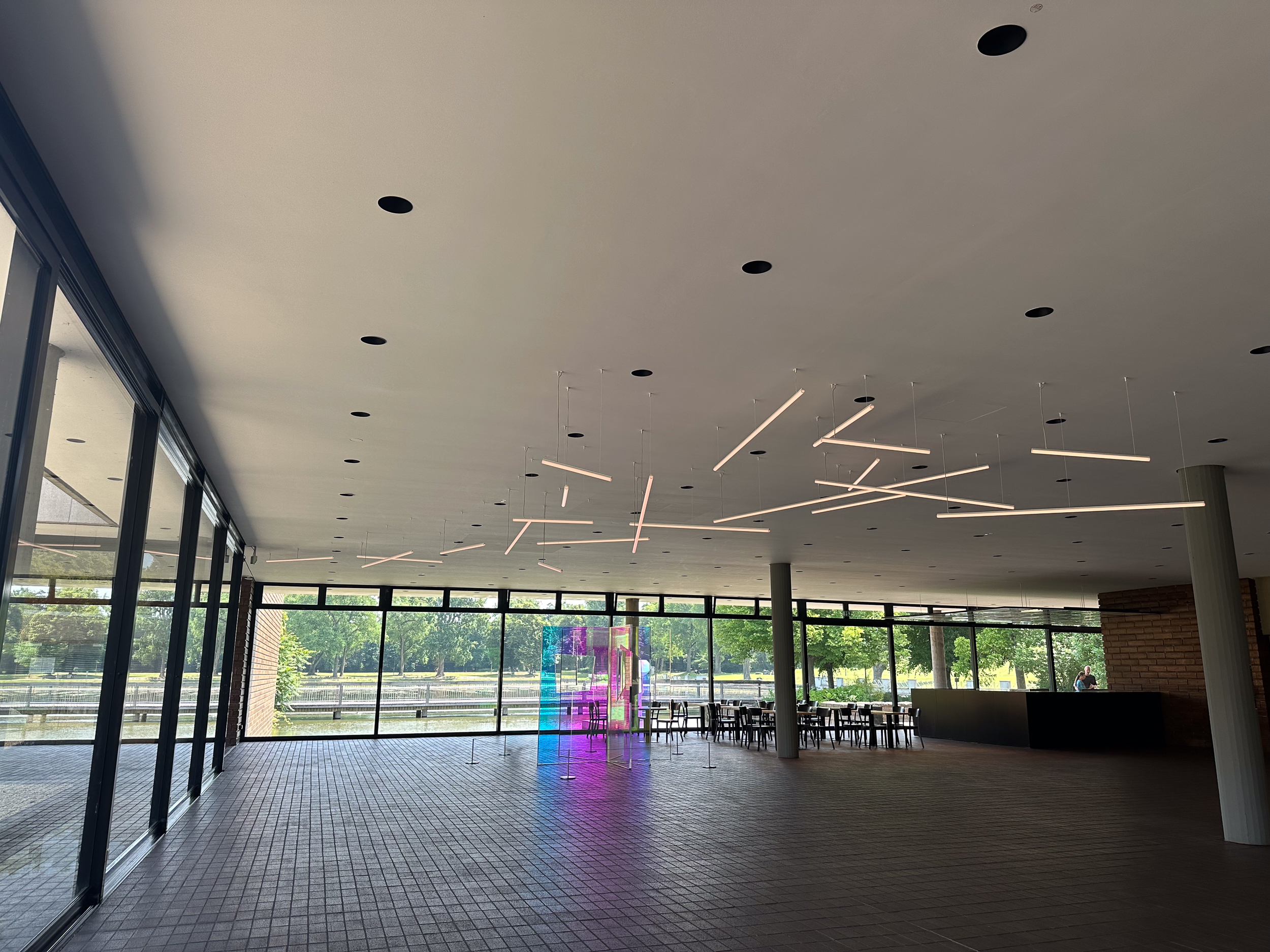 The freestanding acrylic glass sculpture consists of six radially and fan-shaped panels, supported at the base by stainless steel strips and connected at a central point. The panels vary in width and depth and are partially finished with iridescent colored foil. Each panel is perforated, featuring a unique, geometrically shaped, window-like cutout, reminiscent of James Turrell's iconic Skyspace works from the 1970s. The overall structure resembles a revolving door, which we activate step by step. Depending on our position, viewing direction, and focus, the six "windows" frame our views, glimpses, and perspectives. As we walk around the sculpture, the viewpoints and perspectives shift. The overlapping cutouts constantly create new refractions, juxtapositions, and distortions of the field of vision, and thus of spatial perception. Only through our looking and moving forward are the multiple scenes set in motion, image by image, or rather, image-within-an-image. The perceived environment – museum foyer, inner garden, outer park – itself becomes part of the living artwork: framed, filtered, mirrored. Different realities emerge as both limited and boundless spaces. Viewers become aware of the moment of their movement, controlling the pace and intensity of their observation, and sometimes encountering themselves in the form of their own reflection.